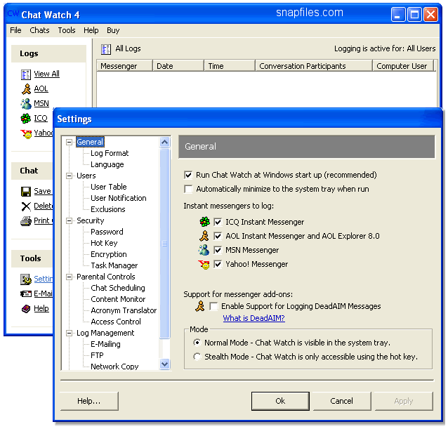 Chat Watch is an instant message monitoring and logging software for today’s mostpopular instant messengers. With Chat Watch you can log all chats onAOL Instant Messenger, MSN Messenger, ICQ, and Yahoo! Messenger.